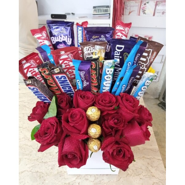20 Mix Chocolate In Box With 10 imported Red Roses Arranged In Box
